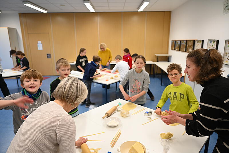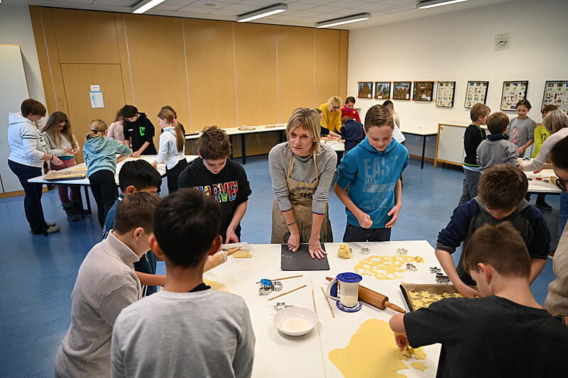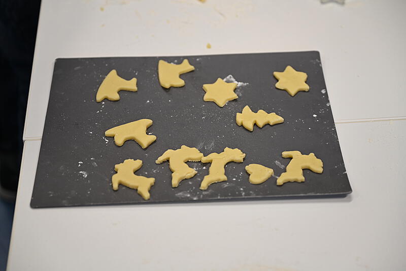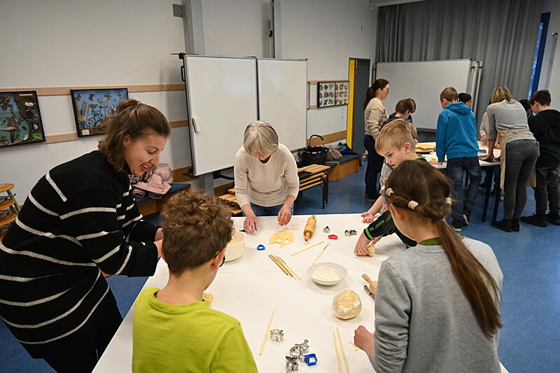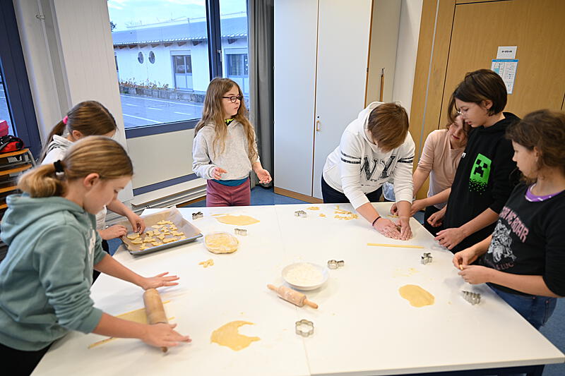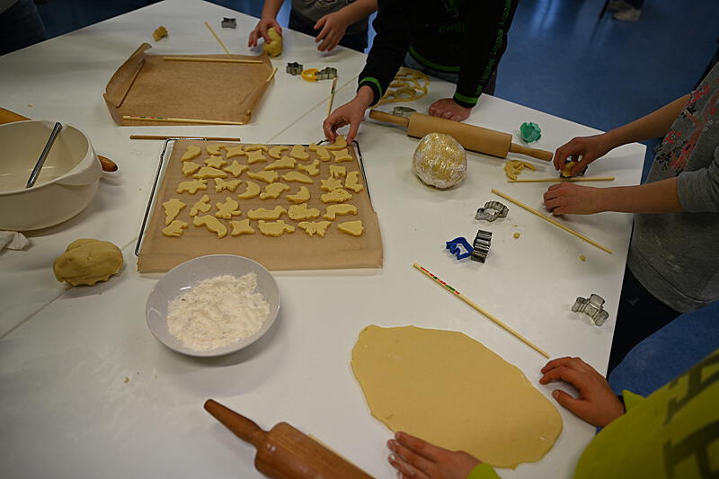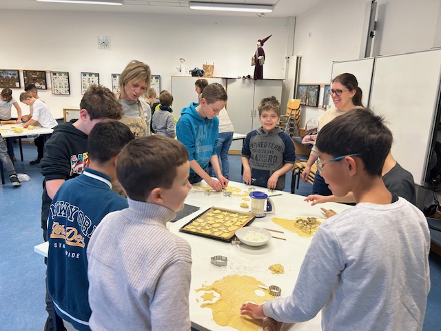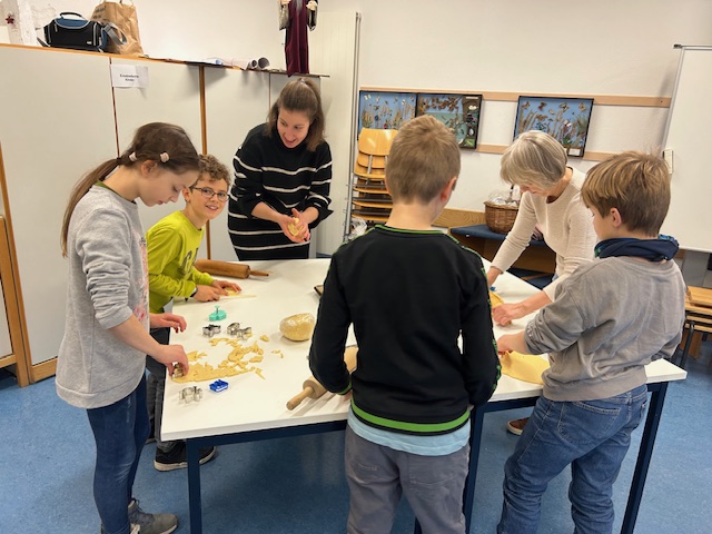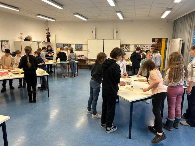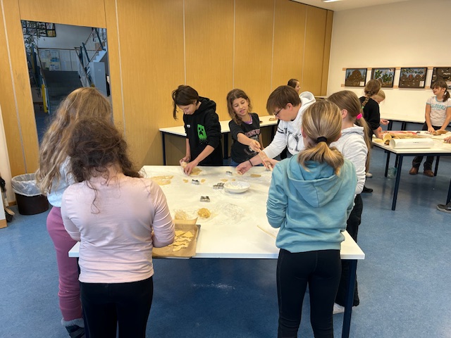 Alle halfen mit. Am 30.11.2023 blockierten wir die Backöfen in der Schule und stachen ca. 1600 Plätzchen aus.
