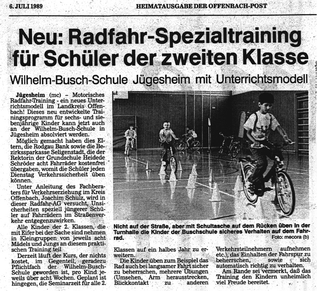 Seit nunmehr 20 Jahren wird an der WBS ein praktischer Radfahrunterricht in Kleingruppen bis zu neun Schülern erteilt. Kinder dieser Altersgruppe fahren zunehmend im Straßenverkehr, weil immer weniger Spielräume zur Verfügung stehen. Die gefährdungsträchtigen Situationen im realen Straßenverkehr sind fast immer diejenigen, die vom Kind bis dahin nicht verlangte Mehrfachhandlungen erfordern. Doch in diesem Bereich sind die Kinder dieser Altersstufe noch überfordert. Motorisches Radfahrtraining hat die Funktion, die Kinder mit Fähigkeiten und Fertigkeiten auszurüsten, damit sie ihren Aufenthalt im Straßenverkehr gefahrlos und leichter bewerkstelligen können. Es stellt keine Vorwegnahme der Radfahrausbildung der 4. Klassen dar. Es dient ausschließlich der Ausprägung der Geschicklichkeit und Koordination, um den Gesamtkomplex "Fahrrad fahren" mit allen Einflüssen besser zu bewältigen.