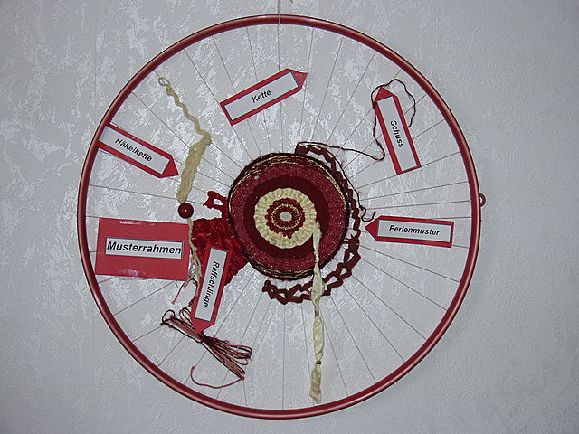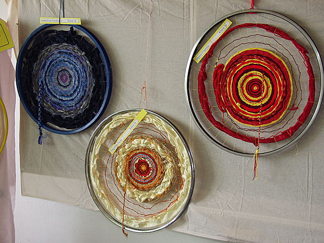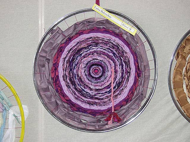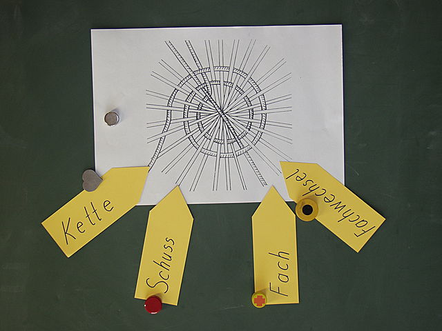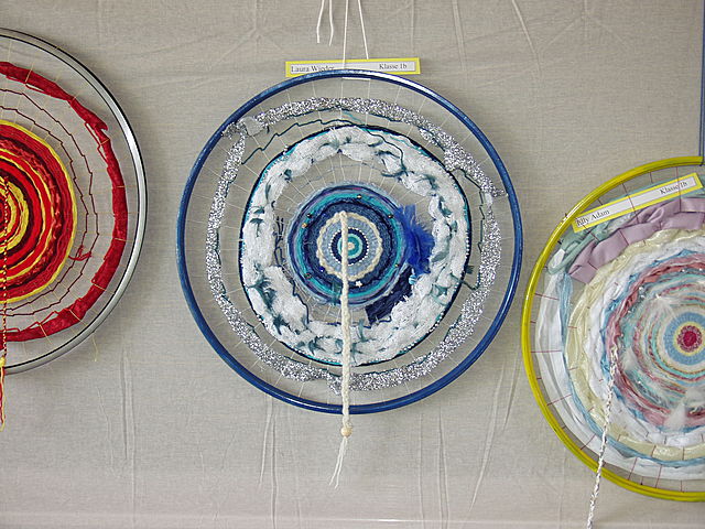 Am schwierigsten war das Aufziehen des Schussfadens. Der Faden war zweimal so lang wie unser Klassenzimmer breit ist. War die Hürde einmal genommen ging es eigentlich leicht weiter: festlegen der Farben, wühlen in unseren Kisten und unermüdlich weben und knoten.