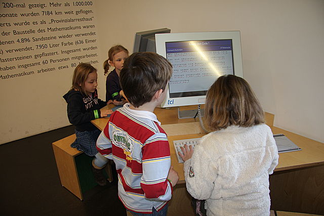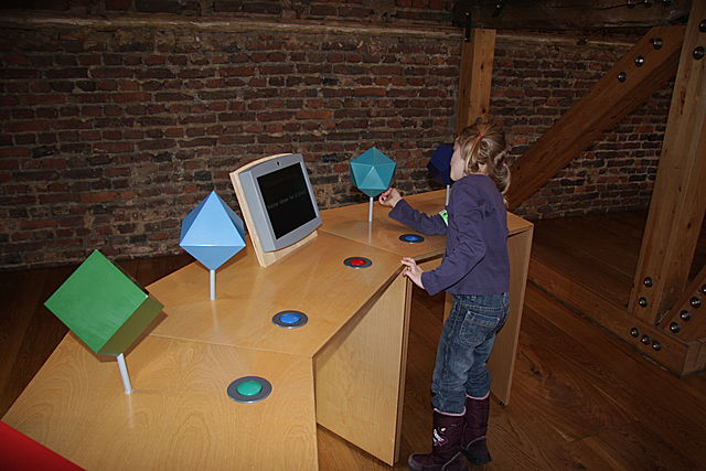 Auf dem Bildschirm erscheint die Frage: "Welcher Körper hat 6 Ecken?" "Richtig, das Oktaeder hat 6 Ecken!", erscheint es auf dem Monitor, wenn die richtige Antwort gedrückt wurde.