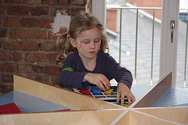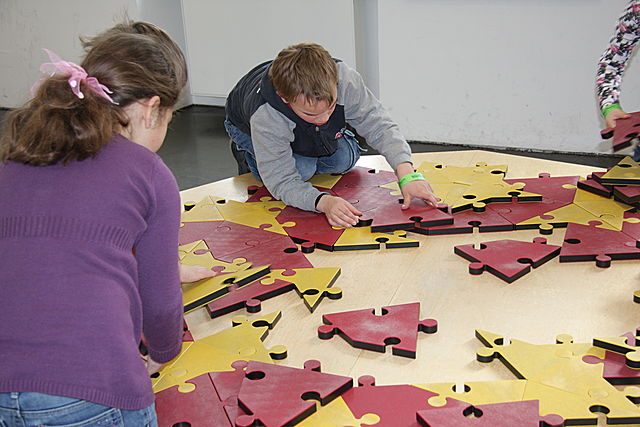 Es sieht aus wie ein Puzzle. Und es ist ein Puzzle. Viele gelbe und rote Steine warten darauf, dass man sie passen aneinander setzt und so den Tisch in eine riesige Blume verwandelt. Am Rand des Tisches sind bereits einige Mosaiksteine vorgegeben, die zum Anlegen weiterer Steine einladen.