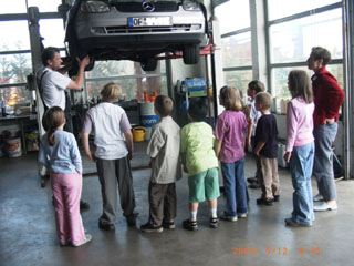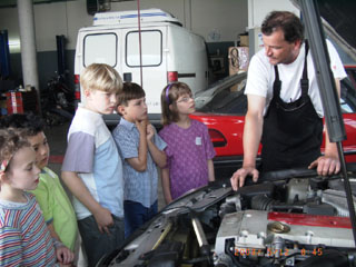 Nach dem Kennenlernen ging es los zur Reperatur-Werkstatt Stefan Heckel im Industriegebiet von Jügesheim. Herr Heckel, Kfz-Meister, hat uns alle wichtigen Teile am Auto erklärt, wie z. B. den Motor, den Auspff, den Tank, den Kühler, den Luftfilter usw. Er hat uns die Abläufe erklärt und uns die verschiednen Teile im Auto gezeigt. Besonders beeindruckend fanden wir, als wir den laufenden Motor bei offener Motorhaube sehen konnten. Auch die Scheibenwischanlage war interessant. Herr Heckel fuhrt das Auto auf der Hebebühne hoch. So konnten wir unter dem Auto den Auspuff und viele andere Teile sehen. Ein modernes Auto (Mercedes SLK) und einen 36 Jahre alten Peugeot zu vergleichen war sehr interessant, denn die Unterschiede waren enorm. Jetzt können wir uns vorstellen, wie ein Auto funktioniert und unseren Eltern an der Tankstelle zeigen, wie man den Reifendruck und den Ölstand misst. Anschließend gingen wir zurück zur Wilhelm-Busch-Schule und sprachen über unsere Erlebnisse. Wir durften auch ein Bild dazu malen und haben mit unseren Betreuerinnen, Karin und Birgit, ein Handwerker-Quiz gespielt.