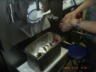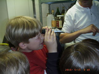 Hurra!!! Heute durften wir zu Luigi - Eis machen. Darauf hatten wir uns schon sehr gefreut. Bei Luigi angekommen gingen wir ins Allerheiligste: der Raum, in dem das Eis hergestellt wird. Als erstes machten wir Stracciatella. Dafür wird Vorzugsmilch von einem Bauern aus Klein_Krotzenburg mit Schlagsahre und Zucker gemischt. Zusammen mit einigen anderen Zutaten wird das Ganze mit 10.000 U/min gemixt, bis es homogenisiert ist. Dann kommt die Masse in die Eismaschine. Diese kühlt sie unter ständigem Rühren auf ca. -7°C ab. Danach kommt das Eis noch 5 - 6 Stunden in den Tiefkühler. Wir durften sofort kosten, denn ein wenig ungeduldig waren wir ja schon. Nun erfuhren wir, wie Bananeneis hergestellt wird. Der Unterschied zum Stracciatella ist, dass es mit Wasser gemacht wird. Wir haben jede Menge Bananen, etwas Zitronensaft, Wasser, Dextrose und Bananenfruchtzubereitung gemixt. Mit dem Refraktometer wurde der Zuckergehalt der Masse geprüft. Das ist deshalb so wichtig, da die Bananen einen unterschiedlichen Fruchtzuckergehalt haben. Dann ab damit in die Eismaschine - schon wieder warten - abfüllen in die Bottiche und probieren. Hmmmm! Besonders wichtig beim Eismachen ist absolute Sauberkeit und genaues Abwiegen der Zutaten. Wisst ihr übrigens, dass so 'ne Eismaschine tierisch viel kostet? Wir wissen es jetzt!
