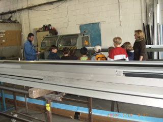 Dann ging es in die Werkstatt. Dort haben wir uns mit Fraum Grimm die verschiedenen Arbeitsschritte beim Fensterbau angesehen, vom Zuschneiden der Rahmen, über das Zusammenbauen und die Befestigung der Fensterbänder (Scharniere) bis zur Montage der Griffe.