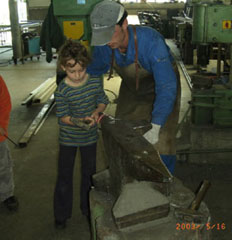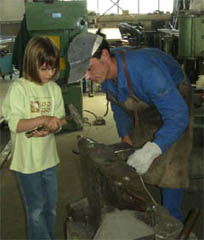 Bereits vor 85 Jahren gründete der Ur-Großvater der heutigen Geschäftsführer, Peter und Werner Grimm, eine Huf- und Wagenschmiede. Frau Grimm erklärte uns wie sich das Berufsbild vom Schmied über den Schlosser bis zum heutigen Metallbauer weiterentwickelt hat. Für uns war die Schmiede das absolute Highlight des Tages. Am Feuer wurden etwa 1/2 cm dicke Eisenstäge zum Glühen gebracht. Mit dem schweren Schmiedehammer hat jeder von uns seinen eigenen Stab über dem Amboss, der etwa 200 kg wiegt, geschmiedet. Das ging überraschend einfach, wo doch keiner von uns vorher den kalten Stab verbiegen konnte. Später durften wir alle durch die Schweißmaske beim Schweißen zusehen. Mit der riesigen Metallbiegemaschine konnte jeder von uns selbst ein Stück Blech biegen.