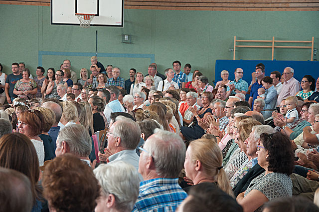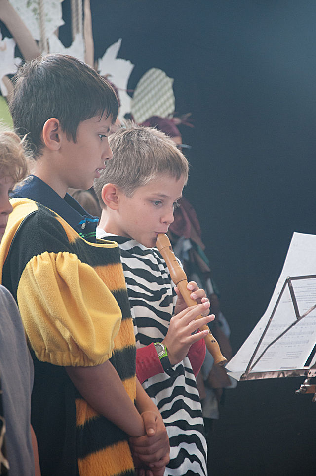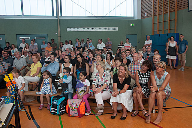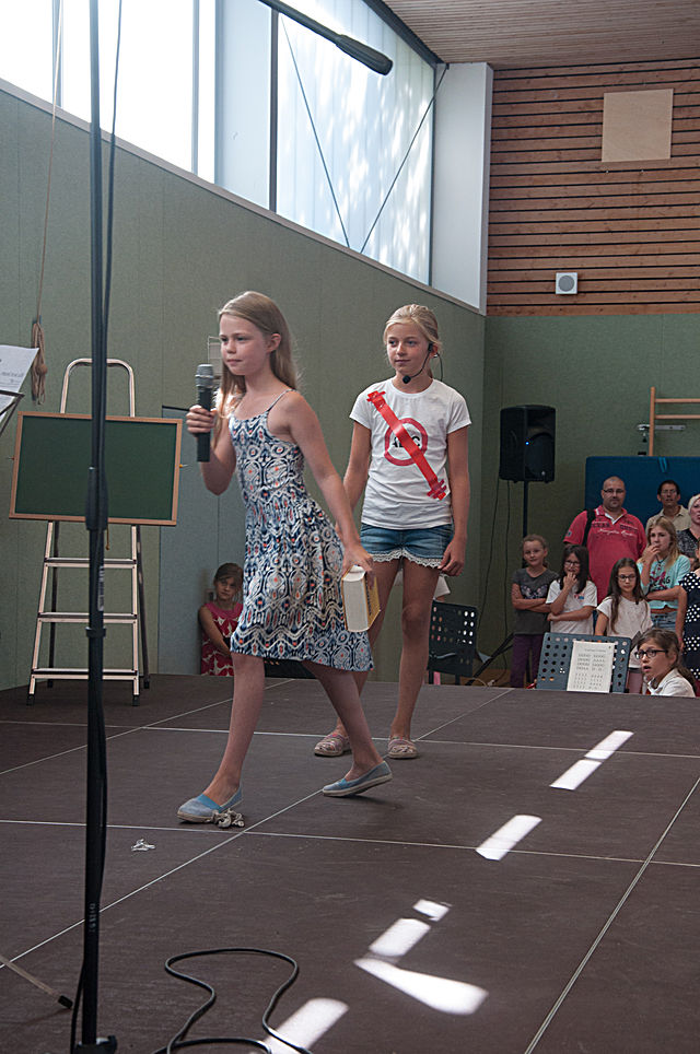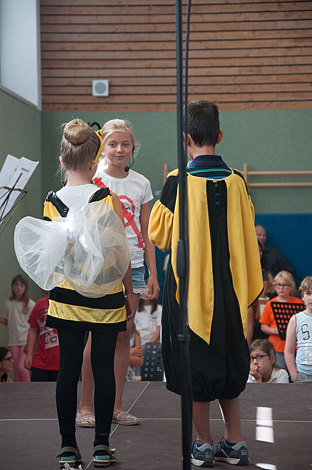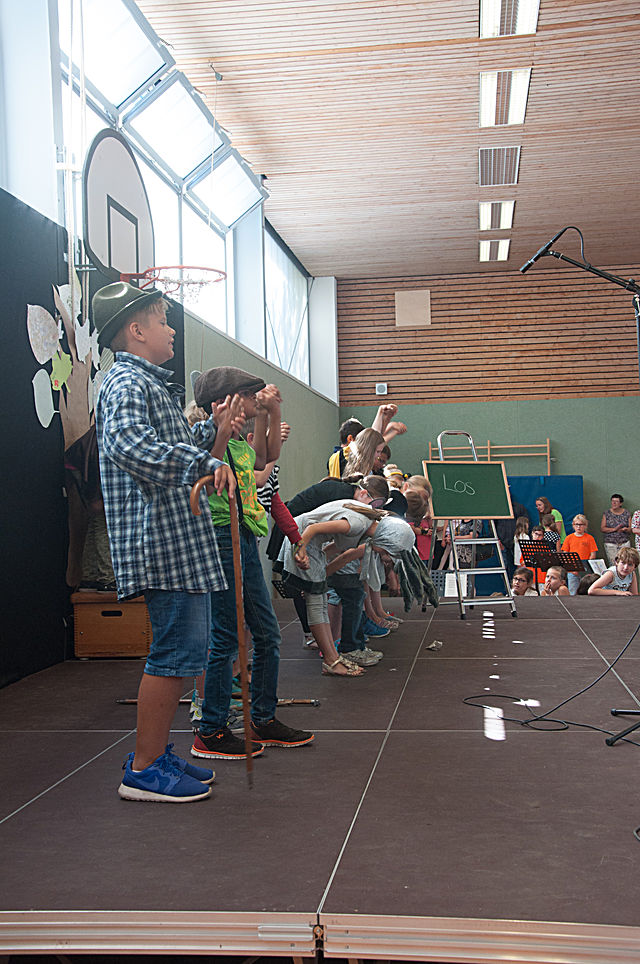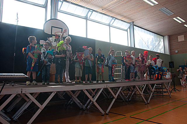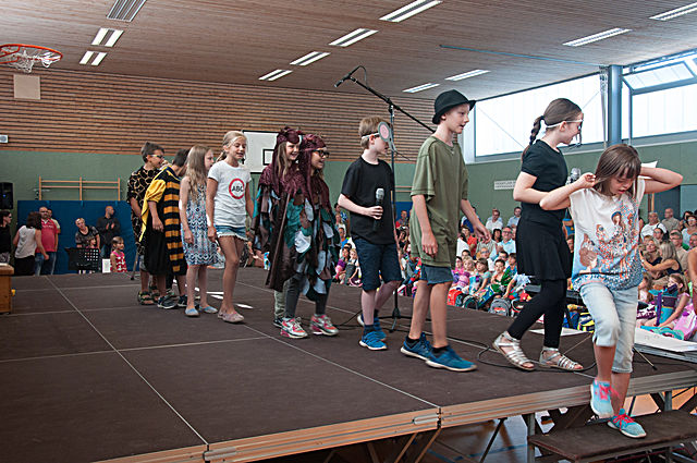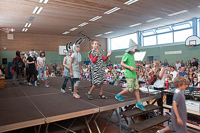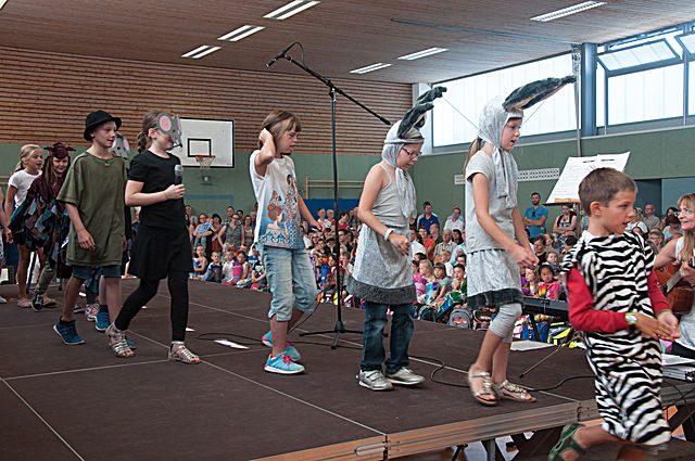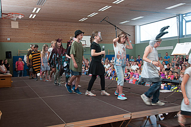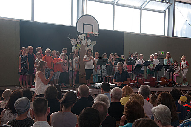 Die Feierlichkeiten begannen um 10:30 Uhr in der Turnhalle. Zunächst wurden die Gäste und die Schulgemeinde mit zwei Liedern des Flötenensembles unter der Leitung von Claudia Krämer fröhlich begrüßt. Die Kinder spielten auf ihren Flöten die Lieder "Pferdekutsche" und "Pippi Langstrumpf". Der Chor sang die Lieder "Lasst uns miteinander" und den WBS-Song.